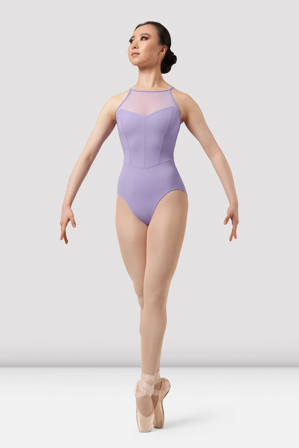 Our Ladies Mirella Chevron Halterneck Leotard features a sweetheart neckline with mesh halterneck panels and chevron rib panelled bodice. Part of the Mirella Chevron collection featuring chevron rib detailing, soft mesh inserts and a hint of floral prints. Available in a range of beautiful silhouettes, this collection exudes charm and poise in a trio of bold tones.